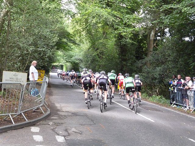 I arrived at the Box Hill circuit slightly after half-past nine. This was after the circuit closure time so I wasn’t allowed to watch the race from my chosen vantage point. I ended up watching the race from the junction between Boxhill Road and Headley Common Road. I wasn’t a bad place to view the race because the riders had to slow right down to negotiate the junction, but it did get a bit crowded by the time the race came through, as more people than me didn’t know when the circuit would be closed. When I returned home after the race I searched the Interwebs and found that the circuit closure time was 09:30. The information was there just not very prominent or accessible. Publicity for the circuit closure times will need to be better for the real event next year. If it is not then crowd problems at the access points are a distinct possibility.