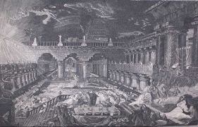 “The Great Day of His Wrath” based on the passage from The Book of Revelation Chapter 6 vs12-17 shows Marin at his apocalyptic apogee. We see people, buildings, whole cities, and mountains being hurled to their destruction in a chasm of fire. Martin is stating his belief that nothing can escape the wrath of God and indeed it is futile to even try.