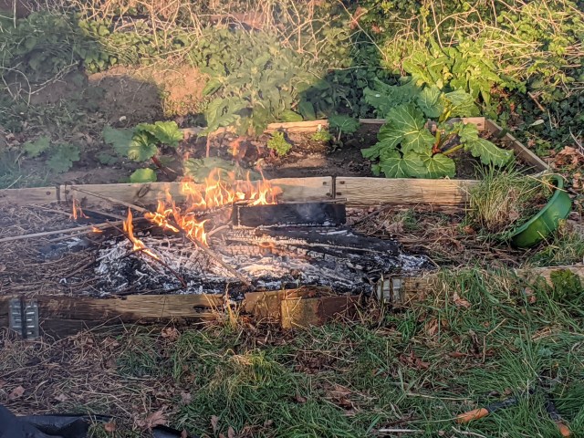 We spent most of the day up there. We had the left-overs from last night’s curry for lunch. We cleared a load of brambles. We dismembered a greenhouse that had arrived courtesy of a winter storm. Then before we went home, we had a bonfire to get rid of the evidence.